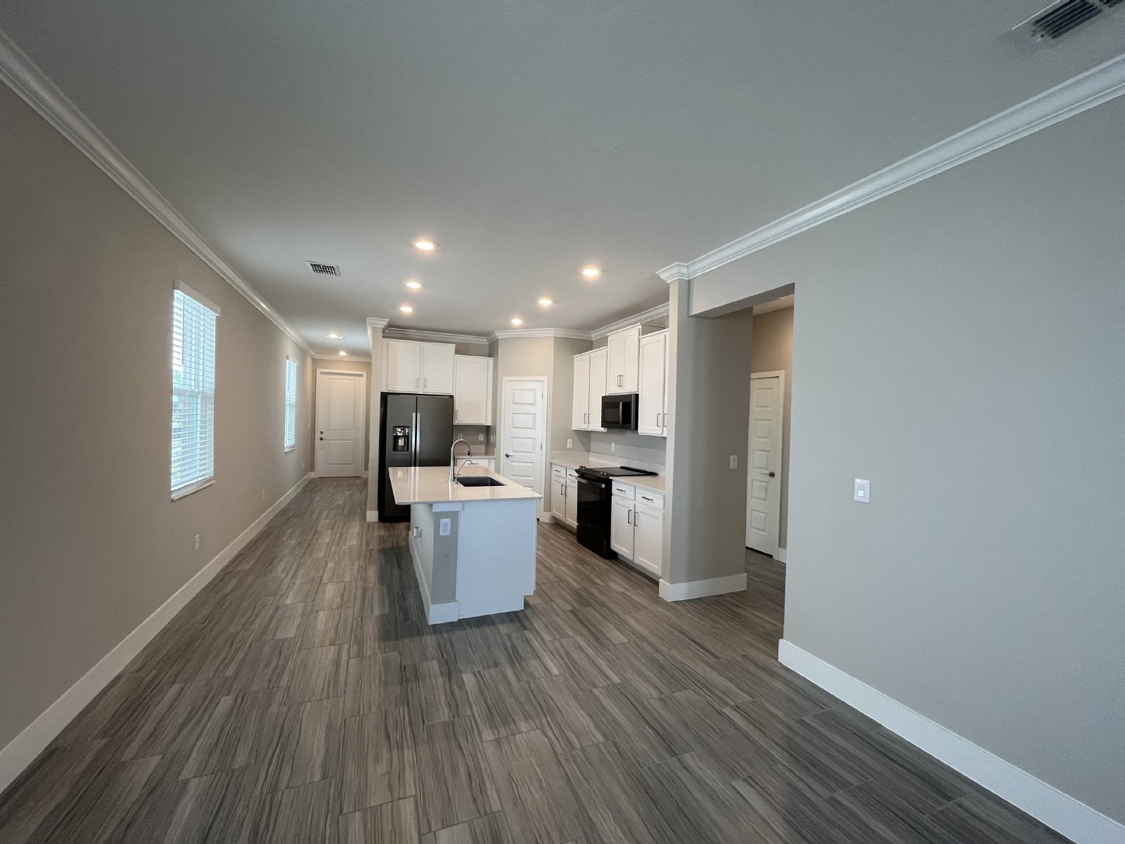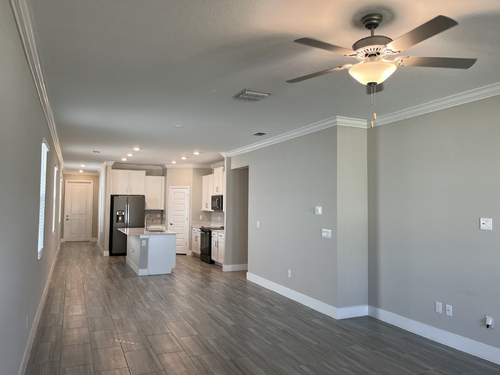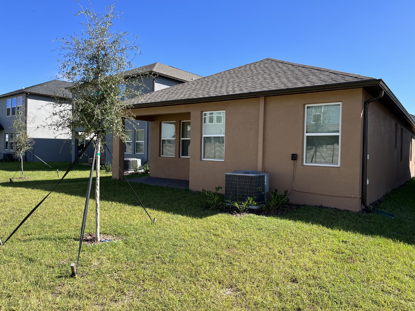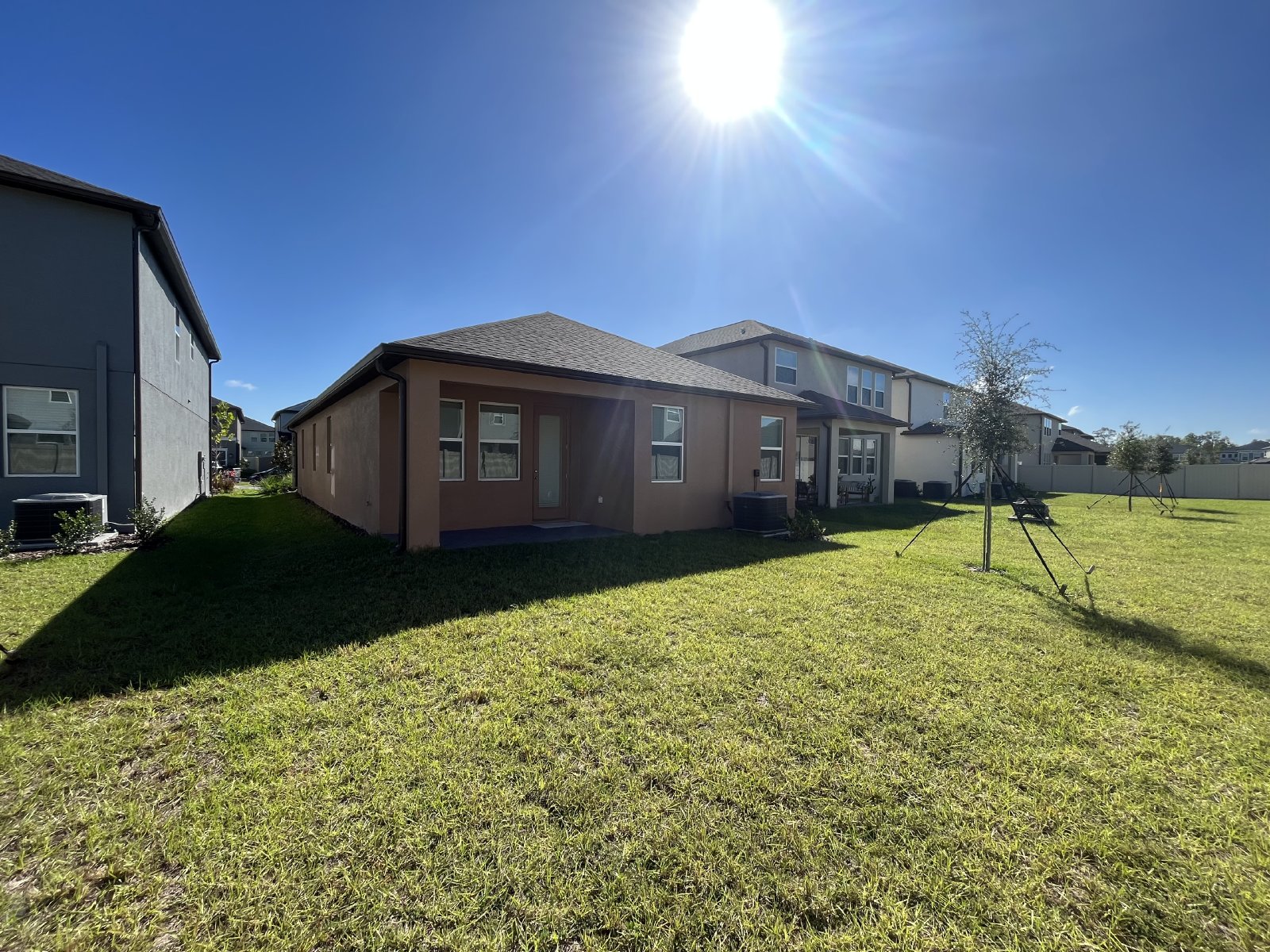 Welcome to the Connerton Village Community. This community offers a 10,000 square foot clubhouse, resort style pool including a kidz zone with a waterpark, a fitness center, Conner Town Cafe, basketball courts, volleyball courts, tennis courts, pickleball courts, an outdoor amphitheater and dog parks. Connerton is a haven for outdoor enthusiasts. Walkers, bikers and runners relish the miles of boardwalks and trails that wind their way through the communities lakes and natural wetlands, making it easy for the residents of Connerton to enjoy the serenity and beauty of the natural landscape. This 2022 built home is a spacious single story home that offers an open floor plan with a living room and open kitchen that features a center island with a breakfast bar, a fridge, stove, dishwasher, and a microwave. The master en-suite bathroom has double sinks and a step in shower. All bedrooms are a nice size and offer high ceilings and ceiling fans. Other features include carpet and tile throughout and a covered patio overlooking a nice sized yard. Do not miss this great new home! It will not last long!